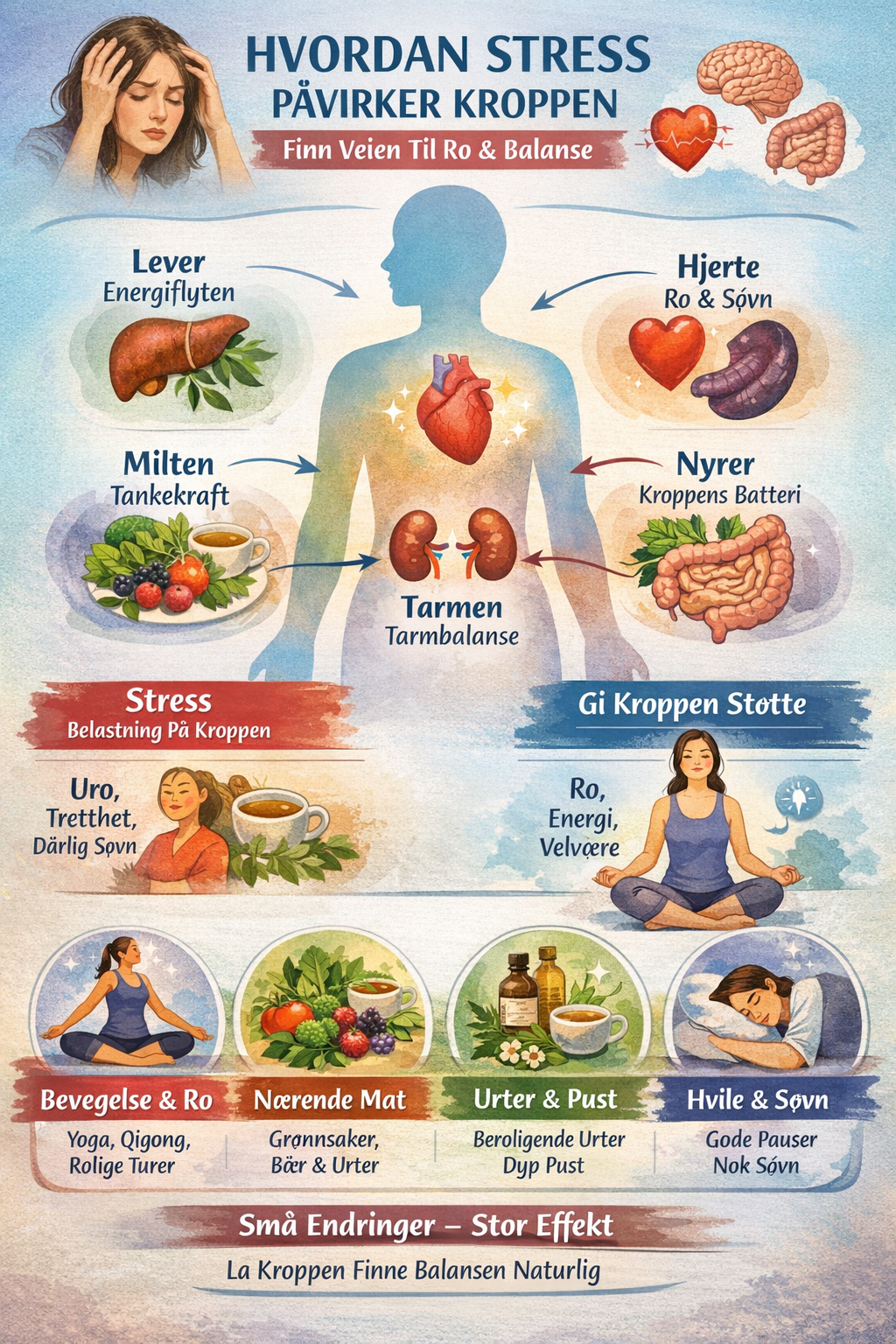 I holistisk medisin involverer stress flere kroppssystemer samtidig, fra leveren som regulerer energiflyten, til hjertet som styrer ro og søvn, milten som holder tankekraften oppe, og nyrene som lagrer livskraften vår. Selv tarmen spiller en rolle, med bakterier som prøver å holde kroppen i balanse når vi utfordrer oss selv.